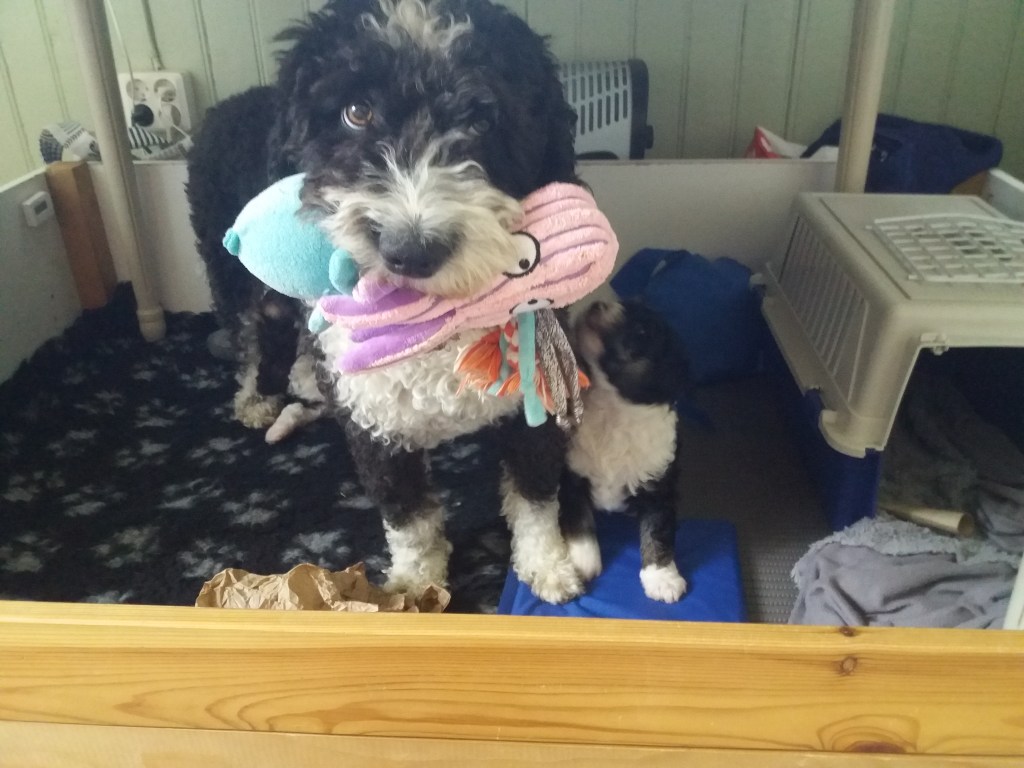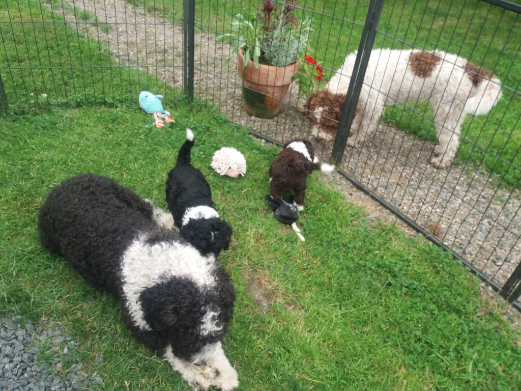 Lilja verkar tycka att hon har för få valpar för hon har ett gäng leksaker som hon behandlar som valpar. Men de ska inte bo med Rio och Ronda utan de ska ha en egen lya i hallen eller ute! Vi kastar in leksaker till valparna för de har börjat leka mer men Lilja är direkt där och bär ut dem igen….! Har aldrig sett detta beteende hos någon tik tidigare.