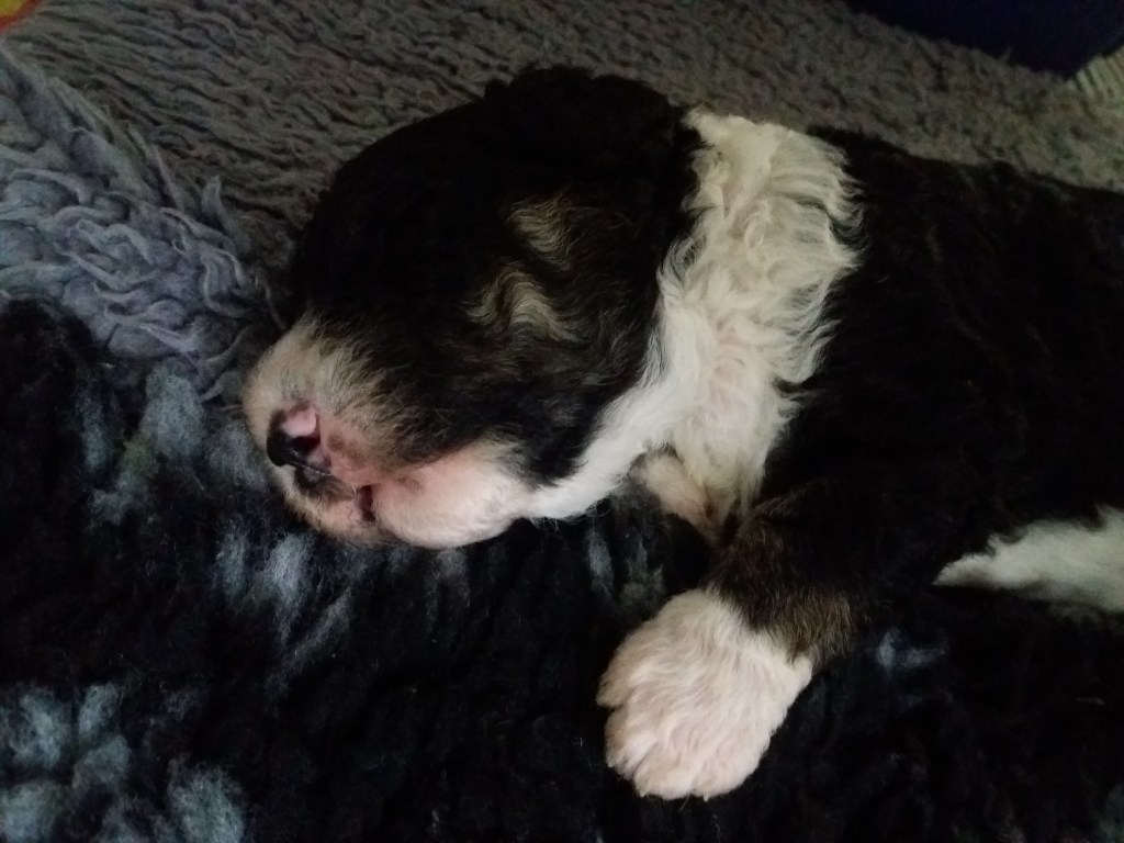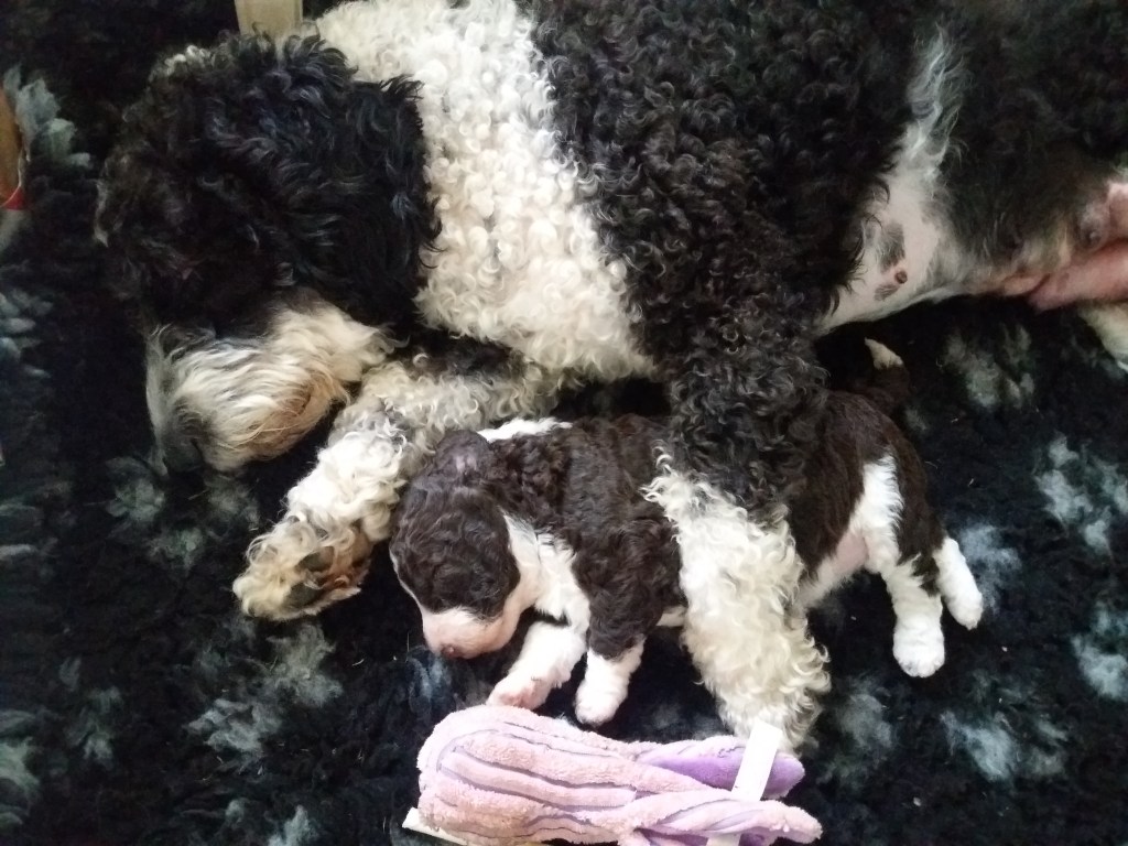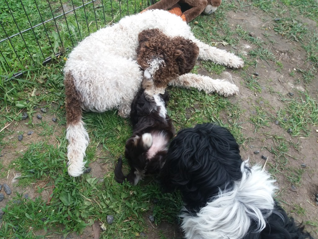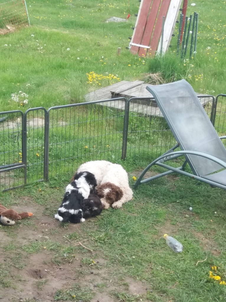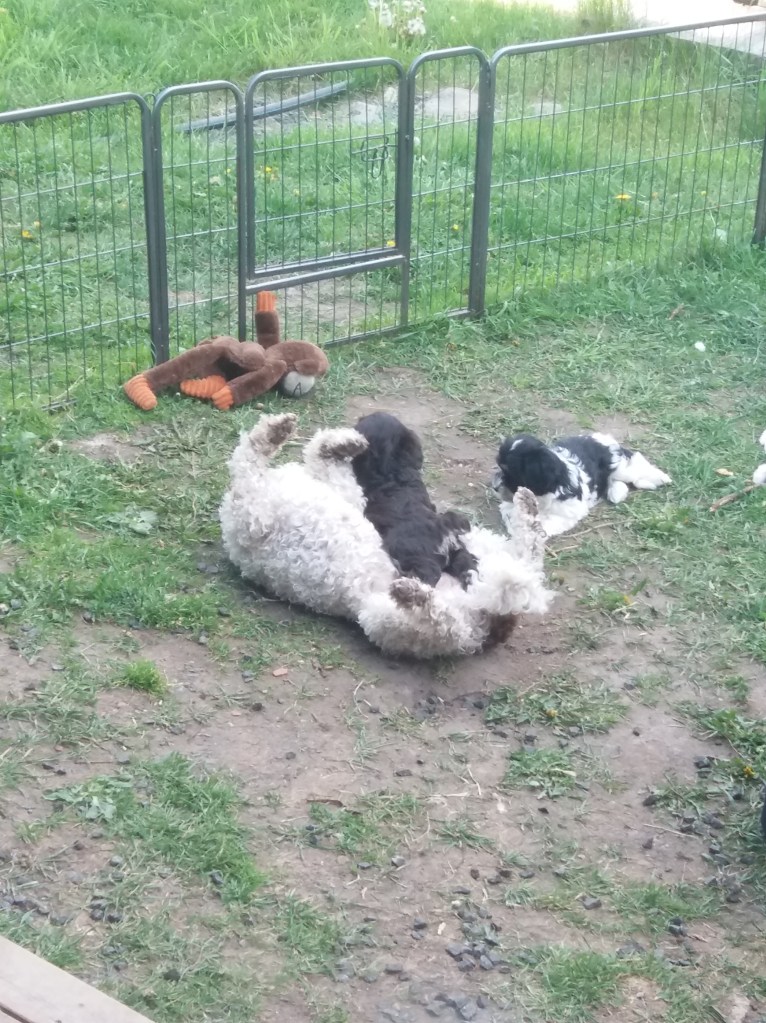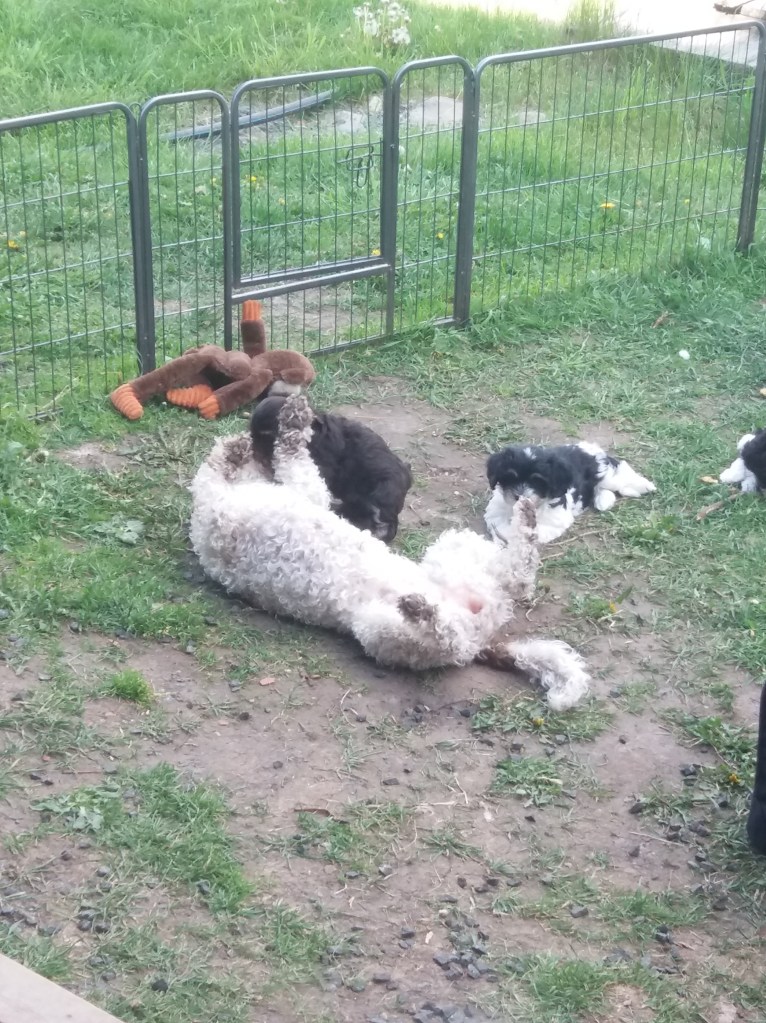 väl hemma igen så fick man leka och gosa med mamma Leja och tant Saga. Vi är så glada att valparna fick en sådan bra lektant i Saga. Då har de fått en första positiv relation med en främmande hund av en annan ras dessutom. Nyttigt